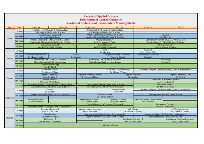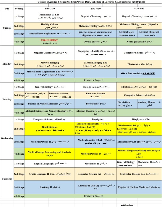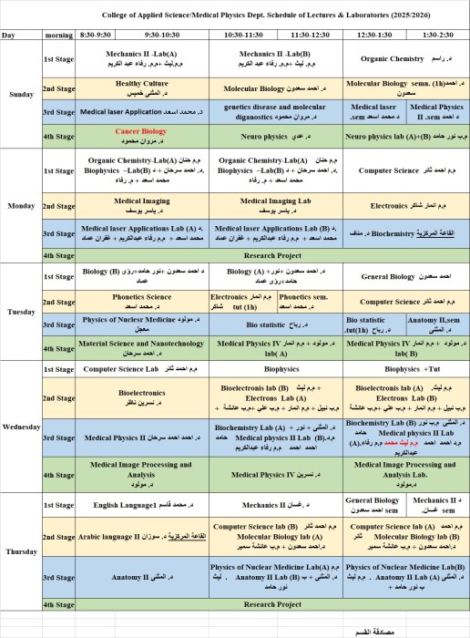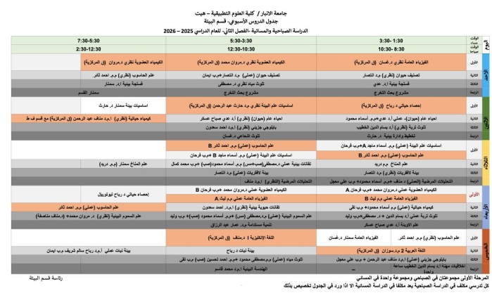 كما تعلن الكلية عن نشر جداول المحاضرات ولجميع المراحل الدراسية وللدراستين الصباحية والمسائية في أقسام الفيزياء الطبية والكيمياء التطبيقية والبيئة، وذلك للاطلاع عليها والالتزام بالمواعيد المحددة للمحاضرات.